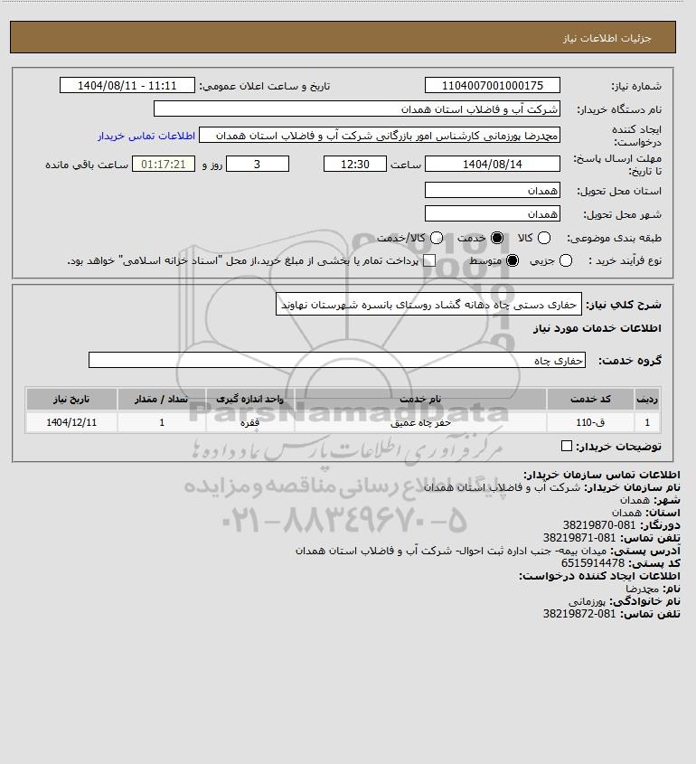 شرح کلی نیاز: حفاری دستی چاه دهانه گشاد روستای بانسره شهرستان نهاوند