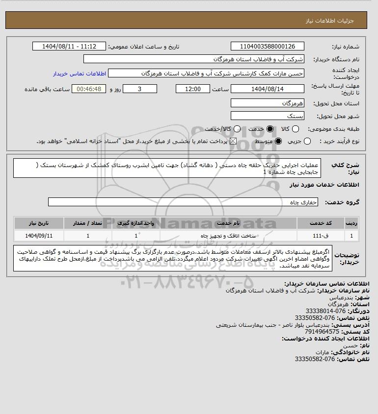 شرح کلی نیاز: عملیات اجرایی حفریک حلقه چاه دستی ( دهانه گشاد) جهت تامین ابشرب روستای کمشک از شهرستان بستک ( جابجایی چاه شماره 1