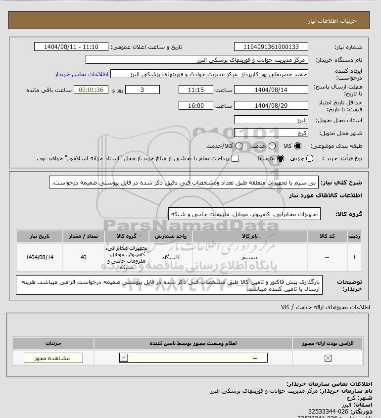 نام دستگاه خریدار: مرکز مدیریت حوادث و فوریتهای پزشکی البرز