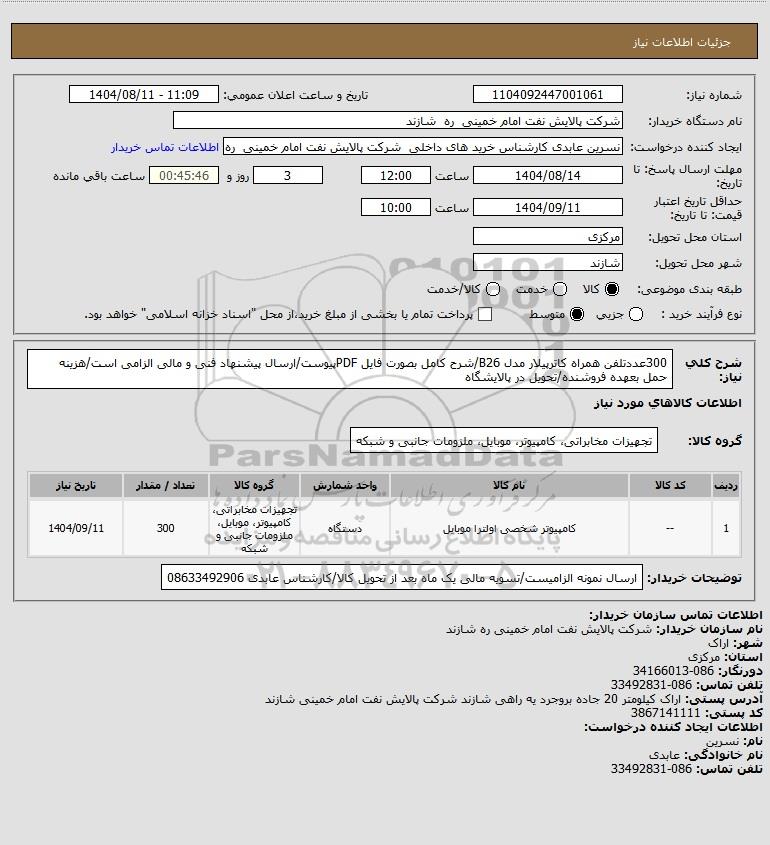 شرح کلی نیاز: 300عددتلفن همراه کاترپیلار مدل B26/شرح کامل بصورت فایل PDFپیوست/ارسال پیشنهاد فنی و مالی الزامی است/هزینه حمل بعهده فروشنده/تحویل در پالایشگاه
