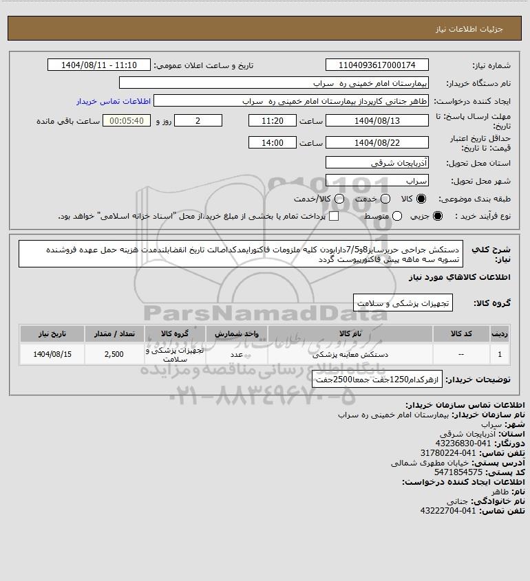 استعلام دستکش جراحی حریرسایز8و7/5دارابودن کلیه ملزومات فاکتورایمدکداصالت تاریخ انقضابلندمدت هزینه حمل عهده فروشنده تسویه سه ماهه پیش فاکتورپیوست گردد, استعلام دستکش جراحی حریرسایز8و7/5دارابودن کلیه ملزومات فاکتورایمدکداصالت تاریخ انقضابلندمدت هزینه حمل عهده فروشنده تسویه سه ماهه پیش فاکتورپیوست گردد