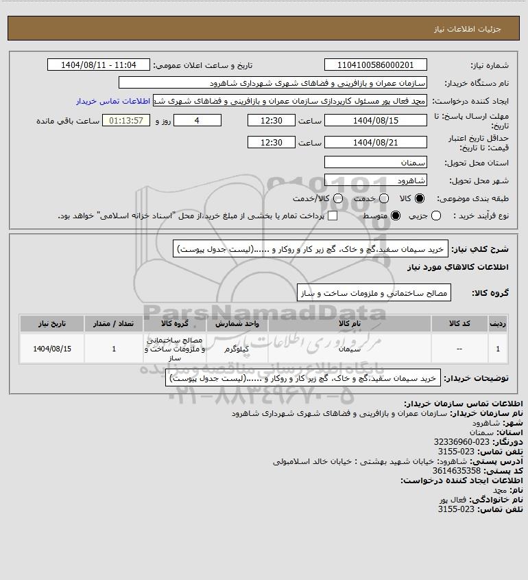 شرح کلی نیاز: خرید سیمان سفید،گچ و خاک، گچ زیر کار و روکار و ......(لیست جدول پیوست)