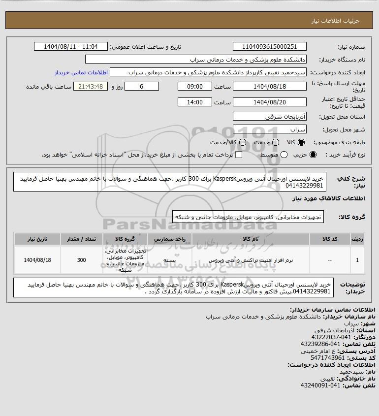 توضیحات خریدار:خرید لایسنس اورجینال آنتی ویروسKaspersk برای 300 کاربر .جهت هماهنگی و سوالات با خانم مهندس بهنیا حاصل فرمایید 04143229981.پیش فاکتور و مالیات ارزش افزوده در سامانه بارگذاری گردد .