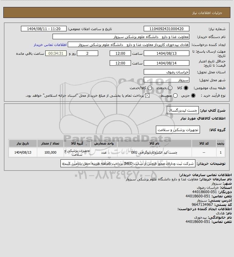 | 1 | -- | چست لید الکتروکاردیوگرافی EKG | عدد | تجهیزات پزشکی و سلامت | 100,000 | 1404/08/13 |
