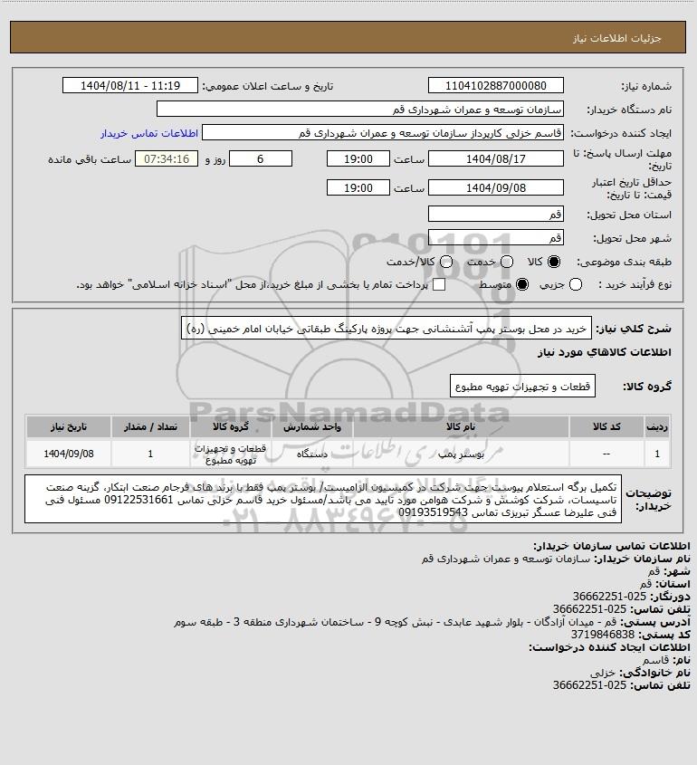 استعلام خرید در محل بوستر پمپ آتشنشانی جهت پروژه پارکینگ طبقاتی خیابان امام خمینی (ره), استعلام خرید در محل بوستر پمپ آتشنشانی جهت پروژه پارکینگ طبقاتی خیابان امام خمینی (ره)