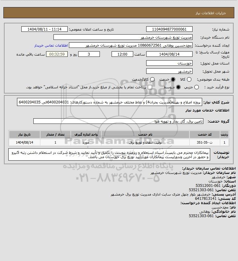 شرح کلی نیاز: پروژه اصلاح و بهینه(مدیریت بحران4) و نقاط مختلف خرمشهر به شماره دستورکارهای: 6400204031الی 6400204035