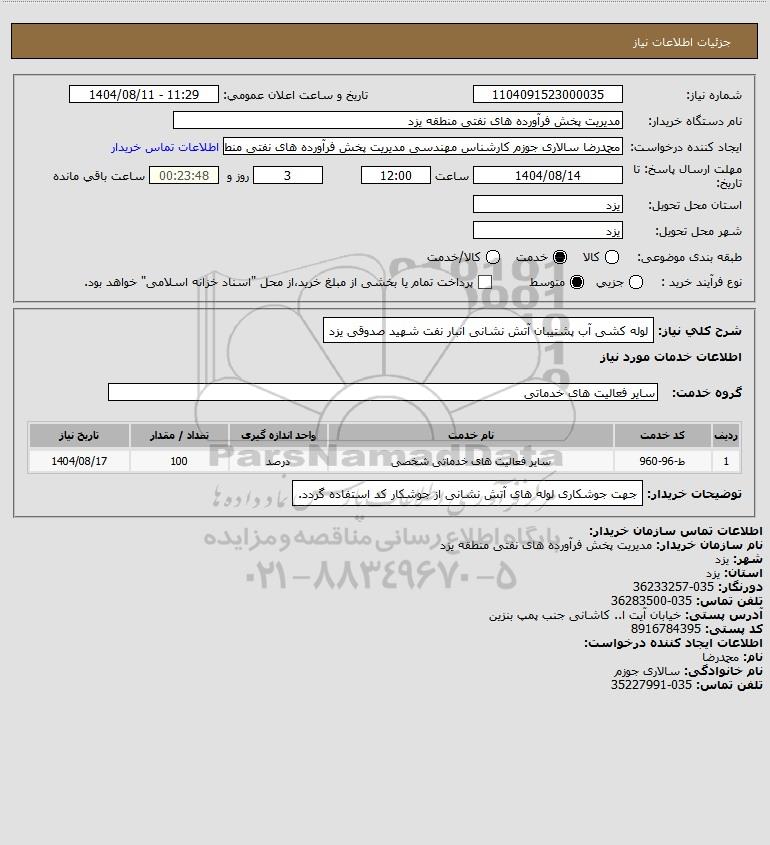 شرح کلی نیاز: لوله کشی آب پشتیبان آتش نشانی انبار نفت شهید صدوقی یزد