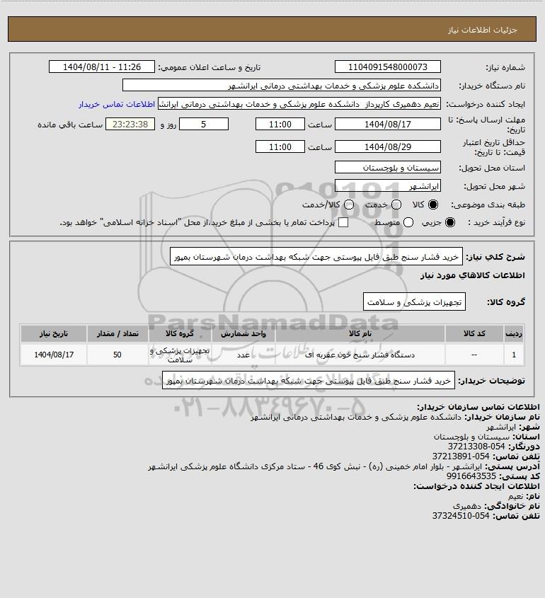 شرح کلی نیاز: خرید فشار سنج طبق فایل پیوستی جهت شبکه بهداشت درمان شهرستان بمپور