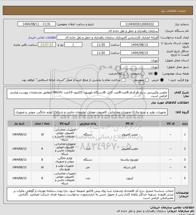 استعلام ماوس وکیبردبی سیم هرکدام 8عدد-8عدد کابل -8دستگاه تلویزیون 22اینچ -10عدد Mini Pc (مطابق مشخصات پیوست وبازدید الزامی است, استعلام ماوس وکیبردبی سیم هرکدام 8عدد-8عدد کابل -8دستگاه تلویزیون 22اینچ -10عدد Mini Pc (مطابق مشخصات پیوست وبازدید الزامی است