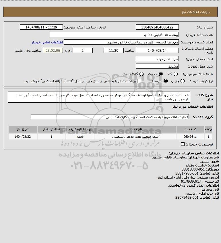 شرح کلی نیاز: خدمات ابلیشن وریدی اندامها توسط دستگاه رادیو فر کوئنسی - تعداد 15عمل مورد نظر می باشد- داشتن نمایندگی معتبر الزامی می باشد.