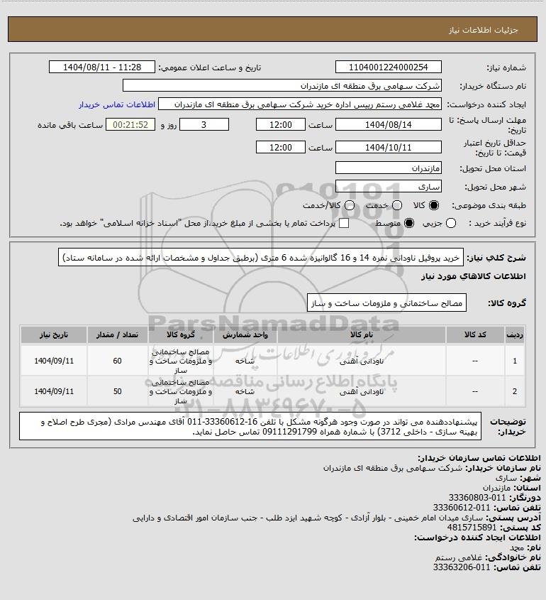 شرح کلی نیاز: خرید پروفیل ناودانی نمره 14 و 16 گالوانیزه شده 6 متری (برطبق جداول و مشخصات ارائه شده در سامانه ستاد)