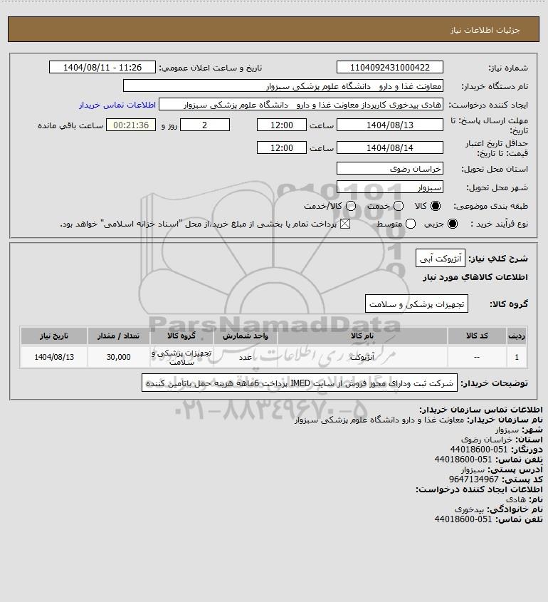 نام دستگاه خریدار:معاونت غذا و دارو دانشگاه علوم پزشکی سبزوار