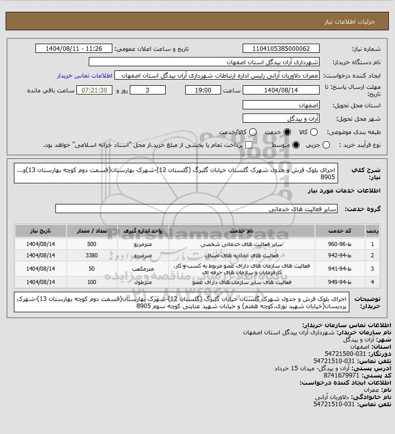 شرح کلی نیاز: اجرای بلوک فرش و جدول شهرک گلستان خیابان گلبرگ (گلستان 12)-شهرک بهارستان(قسمت دوم کوچه بهارستان 13)و... 8905