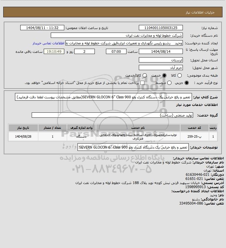 شرح کلی نیاز: تعمیر و رفع خرابی یک دستگاه کنترل ولو SEVERN GLOCON 6” Class 900(مطابق مشخصات پیوست لطفا دقت فرمایید)