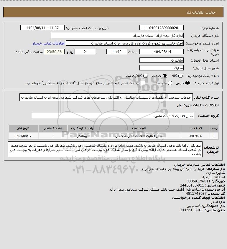 شرح کلی نیاز: خدمات سرویس و نگهداری تاسیسات مکانیکی و الکتریکی ساختمان های شرکت سهامی بیمه ایران استان مازندران