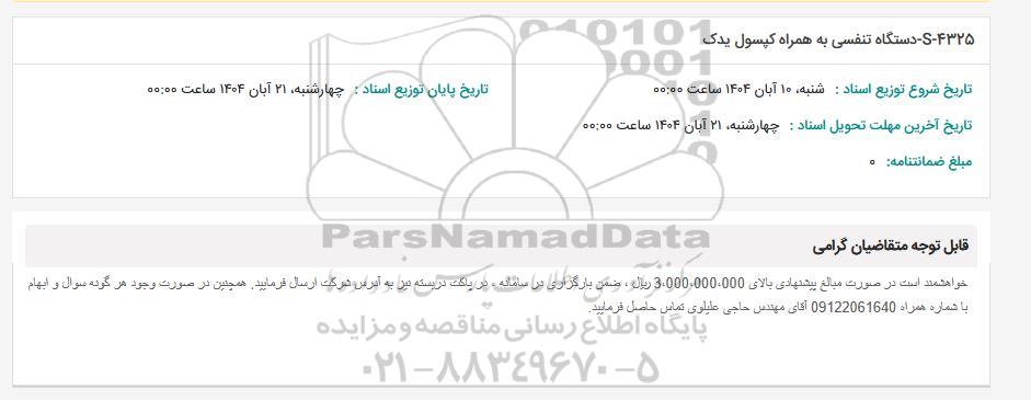 استعلام S-4325 دستگاه تنفسی به همراه کپسول یدک  -مناقصه روز یکشنبه یازدهم آبان ماه 1404, استعلام S-4325 دستگاه تنفسی به همراه کپسول یدک