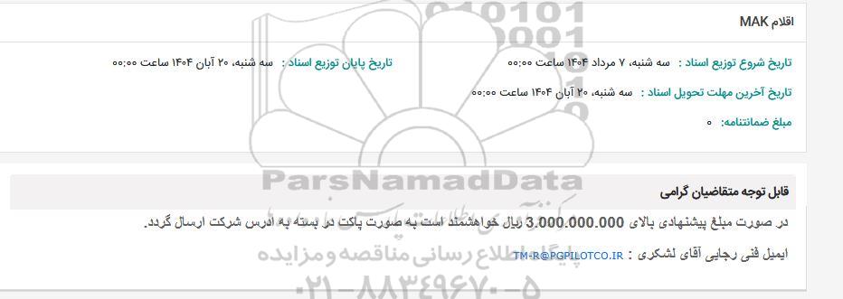 استعلام بها و موضوع استعلام استعلام اقلام MAK به اطلاع کلیه شرکتها و افراد متخصص واجد شرایط میرساند، آگهی گذار در نظر دارد از طریق استعلام بها، نسبت به انتخاب و دریافت پیشنهادات اقدام نماید. این استعلام با کد آگهی ثبت شده در سامانه خبرگزاری پارس نماد : 9786855 منتشر شده است. مشخصات استعلام : تاریخ شروع استعلام: 1404/08/11 آخرین مهلت ارسال پیشنهاد قیمت : 1404/08/20 و محل اجرای پروژه : استان سایر میباشد. استعلام قیمت مورد درخواست : استعلام اقلام MAK با دستهبندیهای تخصصی و گروه های مرتبط : کلیه خدمات و تجهیزات پروژه های دریایی-اسکله،موج شکن ، مشاوره سازه های دریایی -, تجهیزات و ماشین آلات صنعتی, استعلام اطلاع رسانی میگردد. شرایط شرکت در استعلام آنلاین : ابتدا ثبت نام در سامانه استعلام پارس نماد و تکمیل مدارک موردنیاز و بارگذاری در سامانه رعایت تمامی ضوابط و الزامات مندرج در اسناد استعلام است.