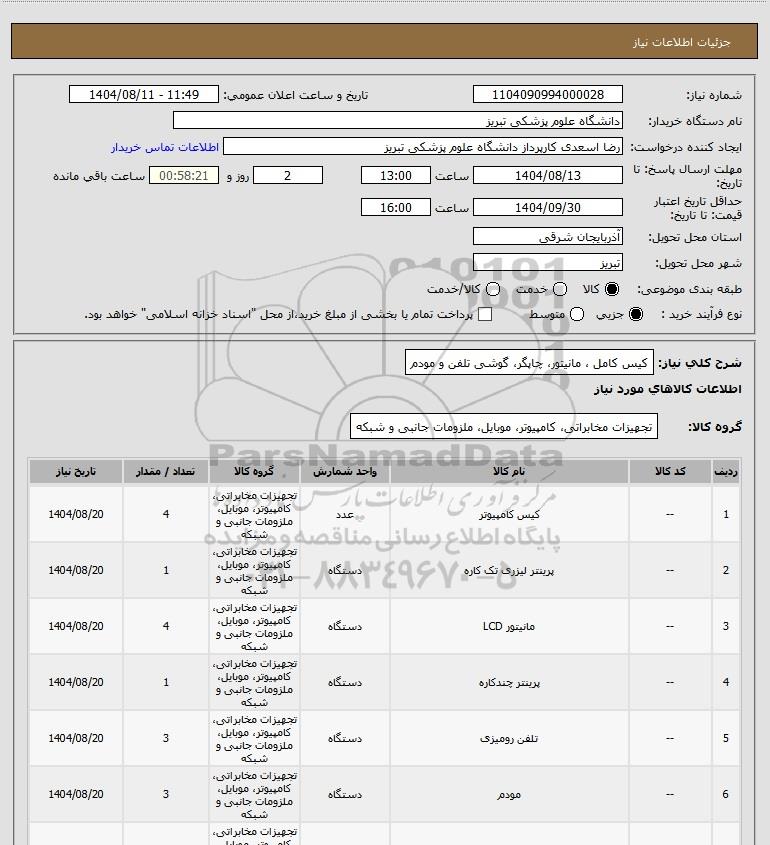 | 1 | -- | کیس کامپیوتر | عدد | تجهیزات مخابراتی، کامپیوتر، موبایل، ملزومات جانبی و شبکه | 4 | 1404/08/20 |