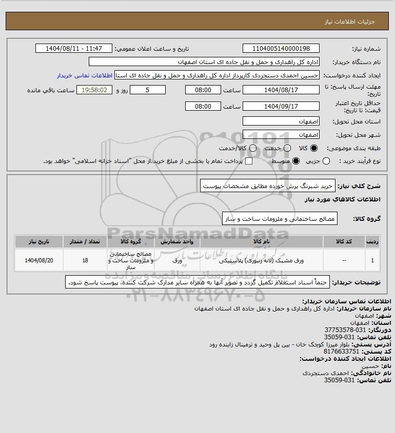 استعلام خرید شبرنگ برش خورده مطابق مشخصات پیوست, استعلام خرید شبرنگ برش خورده مطابق مشخصات پیوست