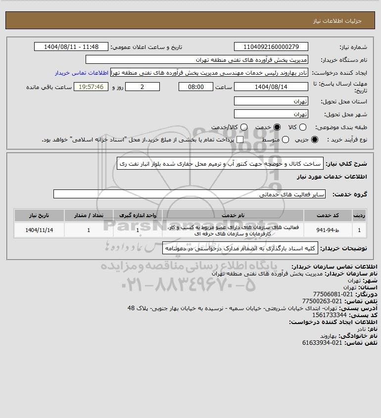 شرح کلی نیاز: ساخت کانال و حوضچه جهت کنتور آب و ترمیم محل حفاری شده بلوار انبار نفت ری