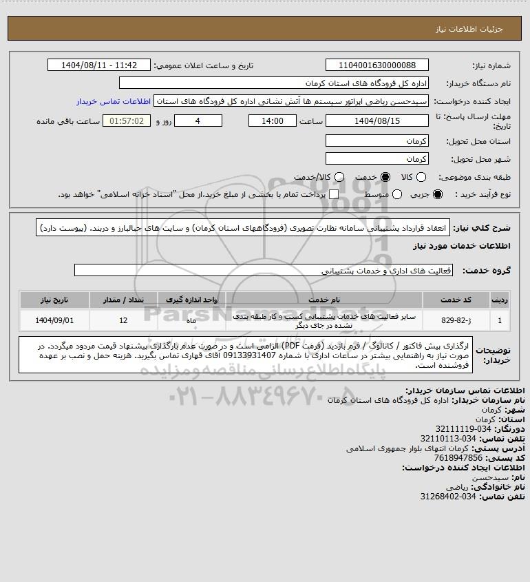 شرح کلی نیاز: انعقاد قرارداد پشتیبانی سامانه نظارت تصویری (فرودگاههای استان کرمان) و سایت های جبالبارز و دربند. (پیوست دارد)