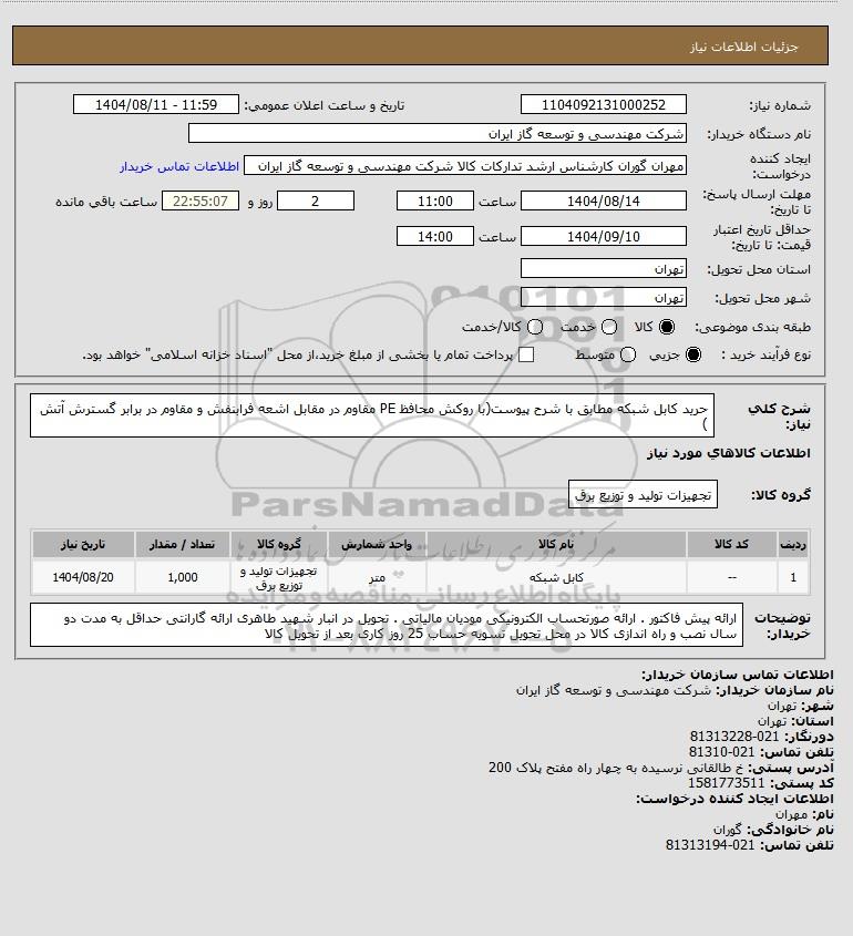 شرح کلی نیاز: حرید کابل شبکه مطابق با شرح پیوست(با روکش محافظ PE مقاوم در مقابل اشعه فرابنفش و مقاوم در برابر گسترش آتش )