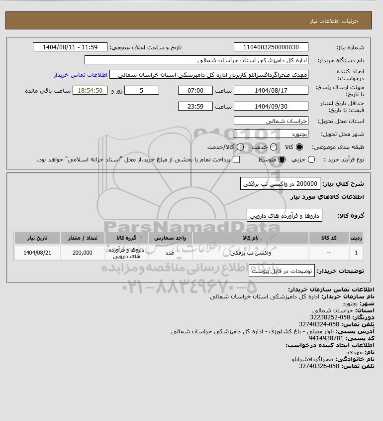 شرح کلی نیاز: 200000 دز واکسن تب برفکی