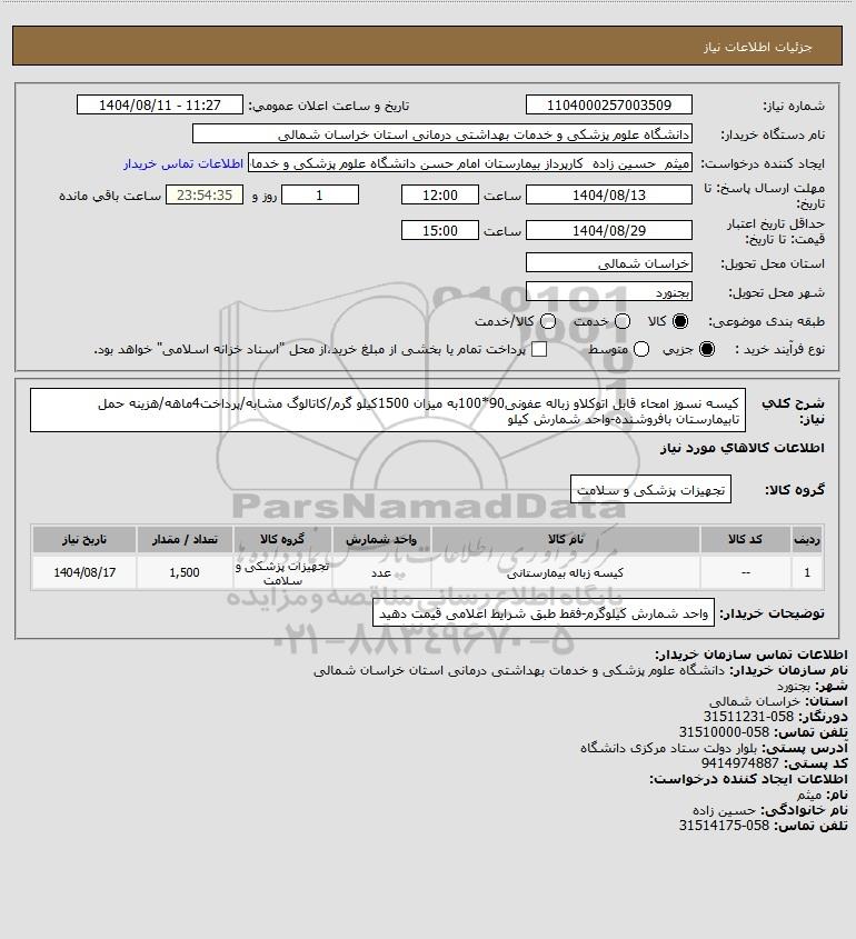 | 1 | -- | کیسه زباله بیمارستانی | عدد | تجهیزات پزشکی و سلامت | 1,500 | 1404/08/17 |