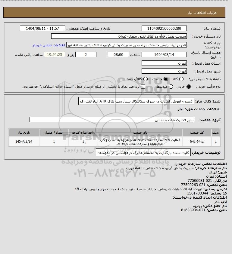 شرح کلی نیاز: تعمیر و تعویض قطعات دو سری میکانیکال سیل پمپ های ATK انبار نفت ری