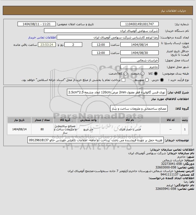 | 1 | -- | فنس یا حصار فلزی | متر مربع | مصالح ساختمانی و ملزومات ساخت و ساز | 80 | 1404/08/14 |