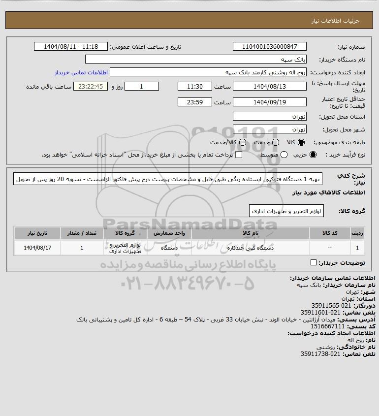 شرح کلی نیاز: تهیه 1 دستگاه فتوکپی ایستاده رنگی طبق فایل و مشخصات پیوست