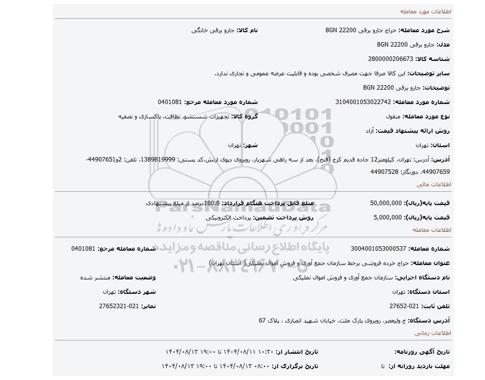| شماره مورد معامله: 3104001053022742 | شماره مورد معامله مرجع: 0401081 | |