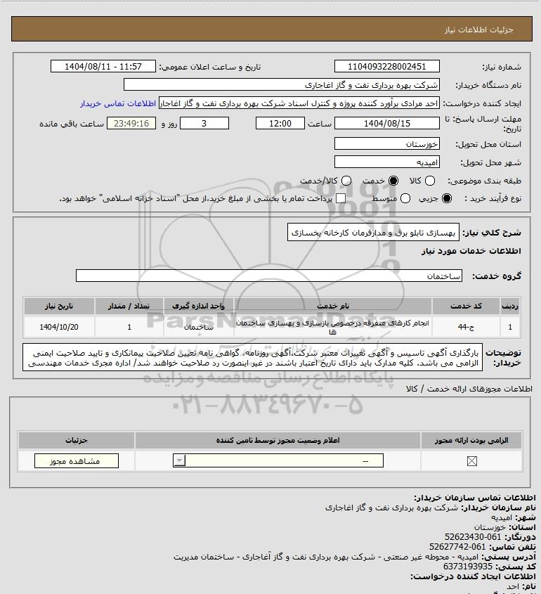 توضیحات خریدار:بارگذاری آگهی تاسیس و آگهی تغییرات معتبر شرکت،آگهی روزنامه، گواهی نامه تعیین صلاحیت پیمانکاری و تایید صلاحیت ایمنی الزامی می باشد. کلیه مدارک باید دارای تاریخ اعتبار باشند در غیر اینصورت رد صلاحیت خواهند شد/ اداره مجری خدمات مهندسی