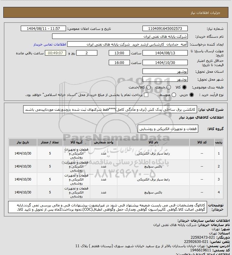 | 3 | -- | رابط سیار برق الکتریکی | عدد | قطعات و تجهیزات الکتریکی و روشنایی | 5 | 1404/10/30 |