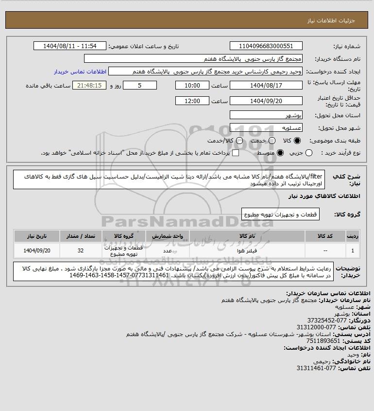 شرح کلی نیاز: filter/پالایشگاه هفتم/نام کالا مشابه می باشد/ارائه دیتا شیت الزامیست/بدلیل حساسیت سیل های گازی فقط به کالاهای اورجینال ترتیب اثر داده میشود
