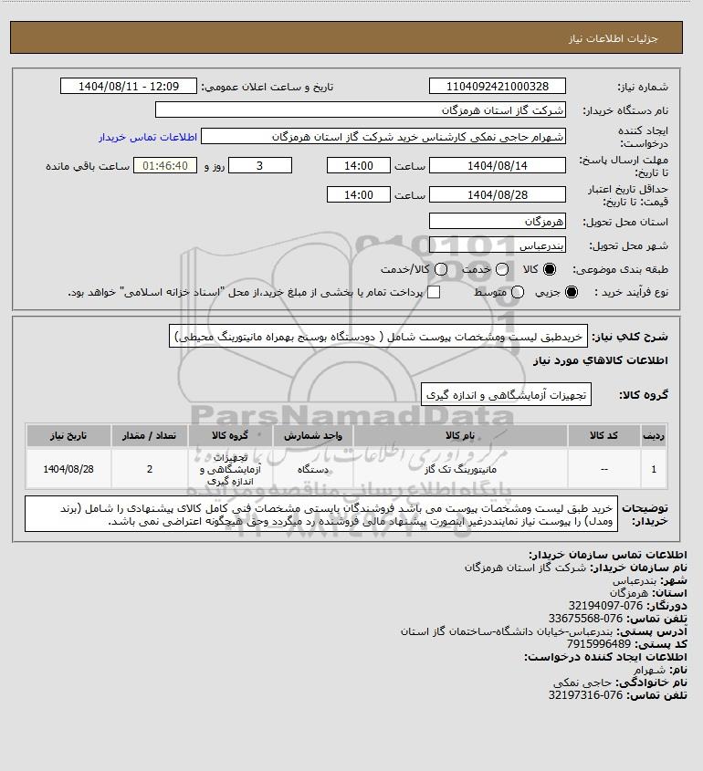 | 1 | -- | مانیتورینگ تک گاز | دستگاه | تجهیزات آزمایشگاهی و اندازه گیری | 2 | 1404/08/28 |