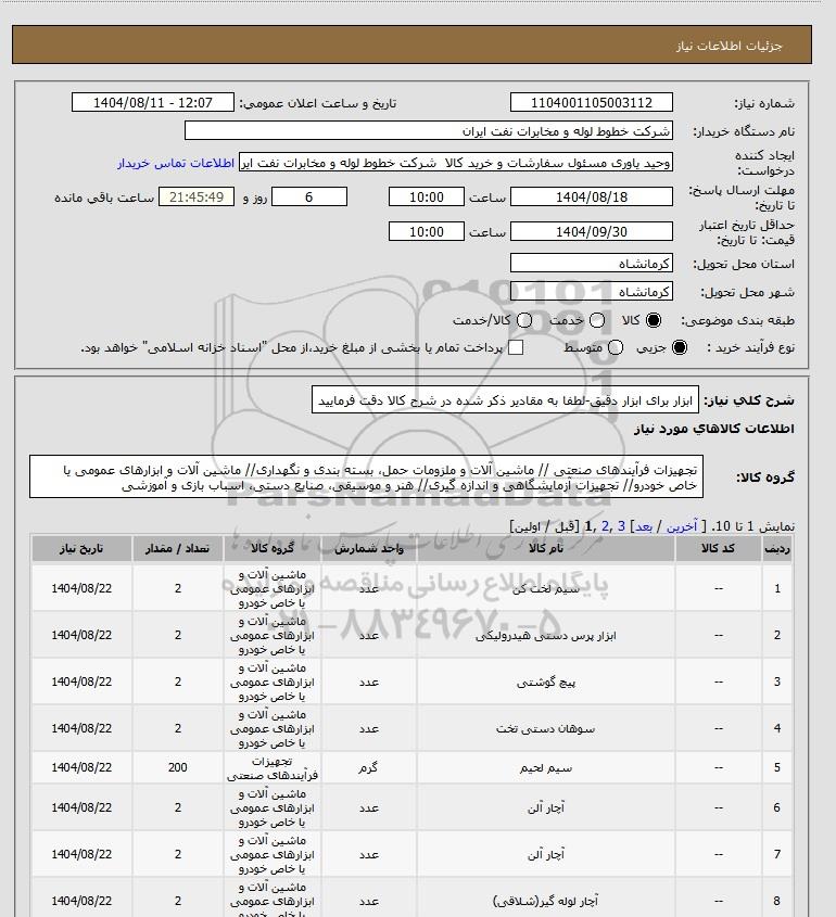 | 1 | -- | سیم لخت کن | عدد | ماشین آلات و ابزارهای عمومی یا خاص خودرو | 2 | 1404/08/22 |