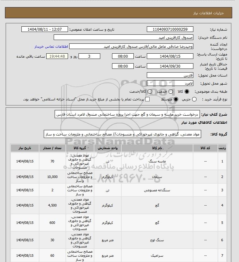 شرح کلی نیاز: درخواست خرید ماسه و سیمان و گچ جهت اجرا پروژه ساختمانی صندوق لامرد استان فارس
