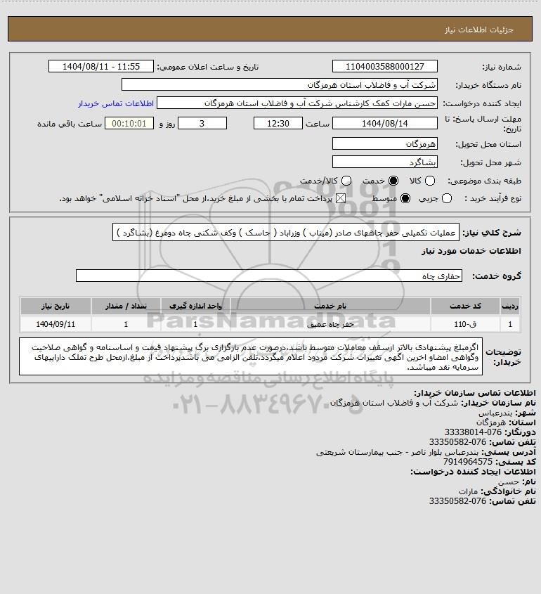 شرح کلی نیاز: عملیات تکمیلی حفر چاههای صادر (میناب ) وزراباد ( جاسک ) وکف شکنی چاه دومرغ (بشاگرد )