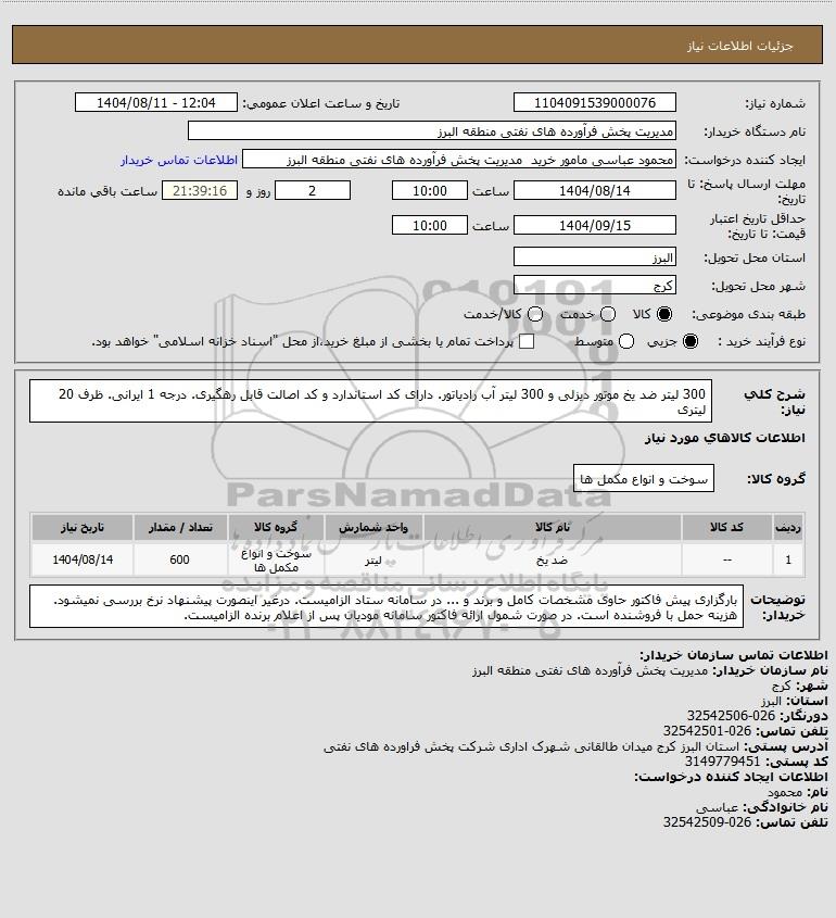 | 1 | -- | ضد یخ | لیتر | سوخت و انواع مکمل ها | 600 | 1404/08/14 |