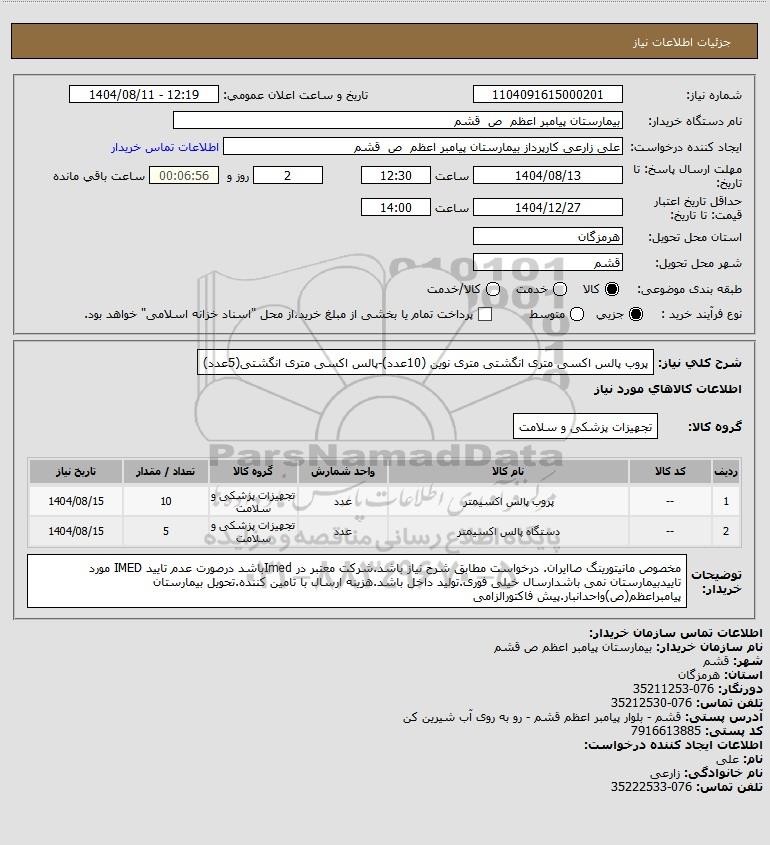 | 2 | -- | دستگاه پالس اکسیمتر | عدد | تجهیزات پزشکی و سلامت | 5 | 1404/08/15 |