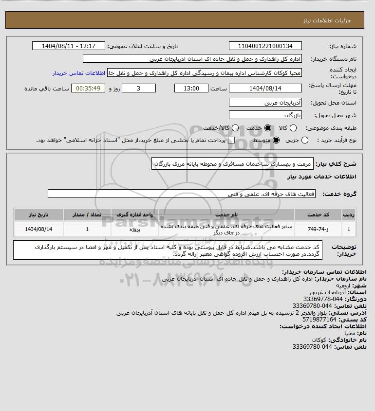 شرح کلی نیاز: مرمت و بهسازی ساختمان مسافری و محوطه پایانه مرزی بازرگان