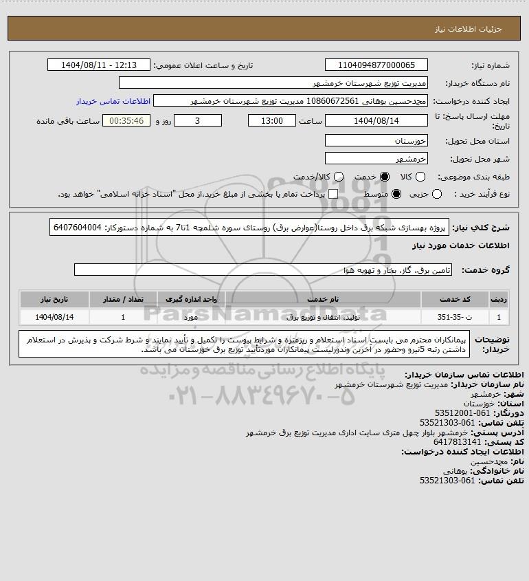 شرح کلی نیاز: پروژه بهسازی شبکه برق داخل روستا(عوارض برق) روستای سوره شلمچه 1تا7 به شماره دستورکار: 6407604004