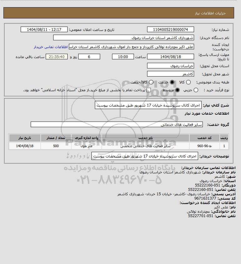 شرح کلی نیاز: اجرای کانال سرپوشیده خیابان 17 شهریور طبق مشخصات پیوست