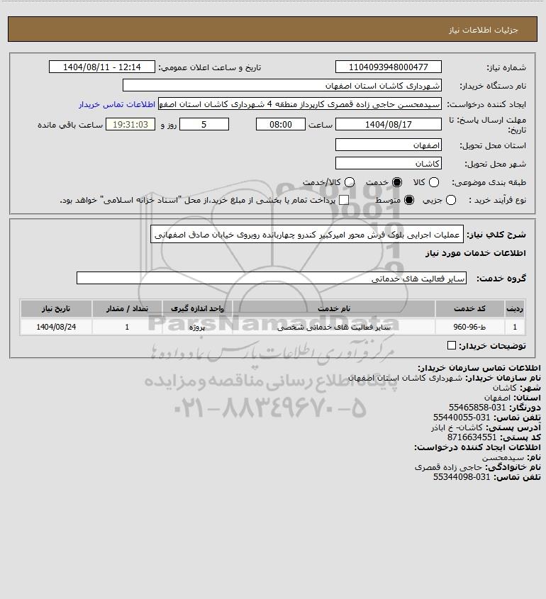 شرح کلی نیاز: عملیات اجرایی بلوک فرش محور امیرکبیر کندرو چهاربانده روبروی خیابان صادق اصفهانی