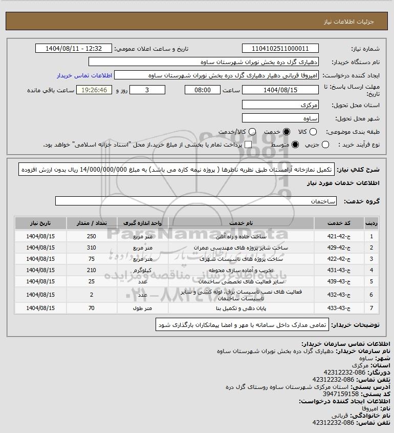 شرح کلی نیاز: تکمیل نمازخانه آرامستان طبق نظریه ناظرها ( پروژه نیمه کاره می باشد) به مبلغ 14/000/000/000 ریال بدون ارزش افزوده