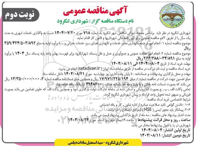 شهرداری لنگرود در نظر دارد بر اساس مصوبه شورای اسلامی شهر لنگرود به شماره 718 مورخ 1404.07.20 نسبت به واگذاری خدمات شهری به مدت