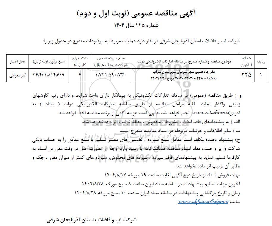 | 1 | 225 | حفر چاه عمیق شهر شربیان شهرستان سراب به شماره 2004001403000228 مورخ 1404.8.10 | 1.721.590.730 | 4 | 34.431.814.619 | غیر عمرانی |