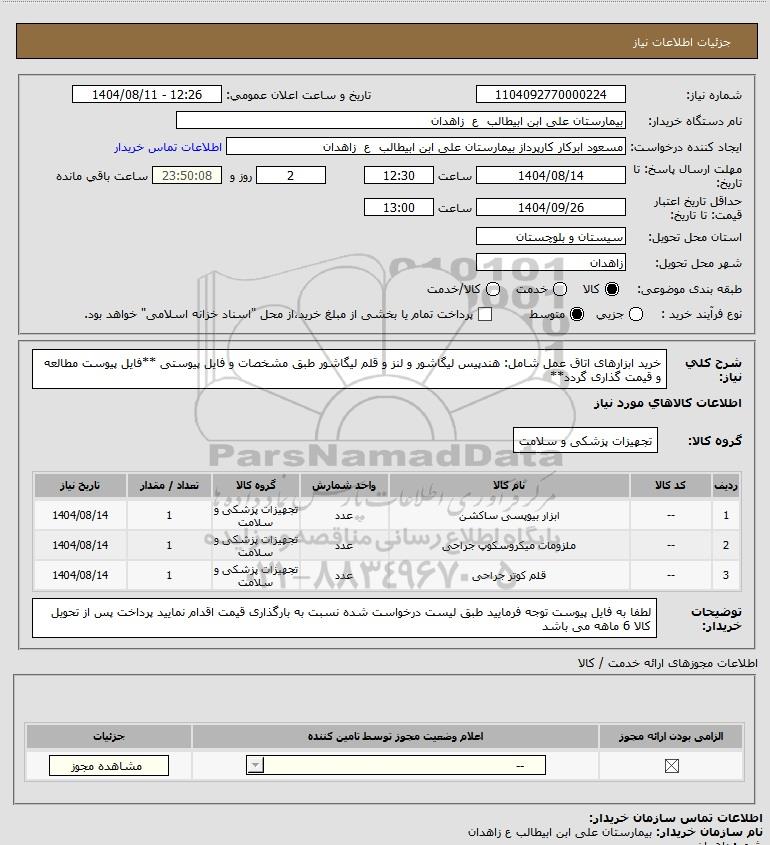 استعلام بها و موضوع استعلام استعلام خرید ابزارهای اتاق عمل شامل: هندپیس لیگاشور و لنز و قلم لیگاشور طبق مشخصات و فایل پیوستی **فایل پیوست مطالعه و قیمت گذاری گردد** به اطلاع کلیه شرکت‌ها و افراد متخصص واجد شرایط می‌رساند، آگهی گذار در نظر دارد از طریق استعلام بها، نسبت به انتخاب و دریافت پیشنهادات اقدام نماید. این استعلام با کد آگهی ثبت شده در سامانه خبرگزاری پارس نماد : 9787360 منتشر شده است. مشخصات استعلام : تاریخ شروع استعلام: 1404/08/11 آخرین مهلت ارسال پیشنهاد قیمت : 1404/08/14 و محل اجرای پروژه : استان سیستان و بلوچستان میباشد. استعلام قیمت مورد درخواست : استعلام خرید ابزارهای اتاق عمل شامل: هندپیس لیگاشور و لنز و قلم لیگاشور طبق مشخصات و فایل پیوستی **فایل پیوست مطالعه و قیمت گذاری گردد** با دسته‌بندی‌های تخصصی و گروه های مرتبط : خدمات و تجهیزات آزمایشگاهی و پزشکی, استعلام اطلاع رسانی میگردد.