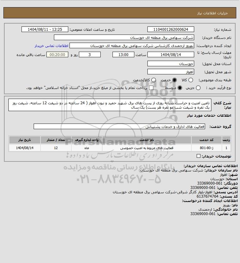 شرح کلی نیاز: تامین امنیت و حراست شبانه روزی از پست های برق شهید حمید و نبوت اهواز ( 24 ساعته در دو شیفت 12 ساعته، شیفت روز یک نفره و شیفت شب دو نفره هر پست) یک سال